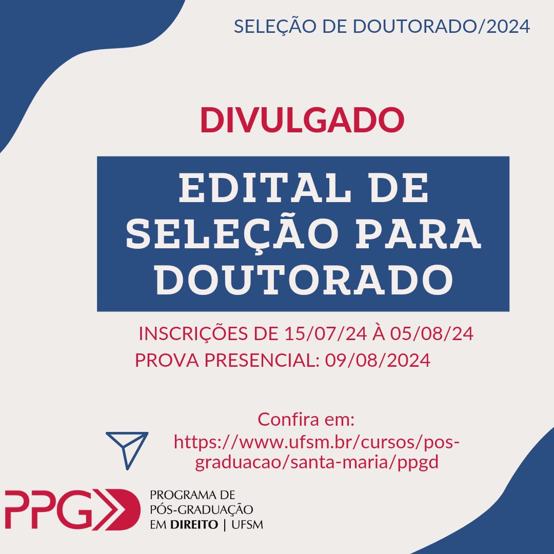 EDITAL DE SELEÇÃO DE BOLSISTAS Nº 003/2025-PPGD/UFSM, DO PROGRAMA DE BOLSAS DEMANDA SOCIAL/CAPES – DoutoradoA Comissão de Bolsas do Programa de Pós-Graduação em Direito, designada pela Portaria de pessoal n. 308, CCSH/UFSM, de 04 de dezembro [...]