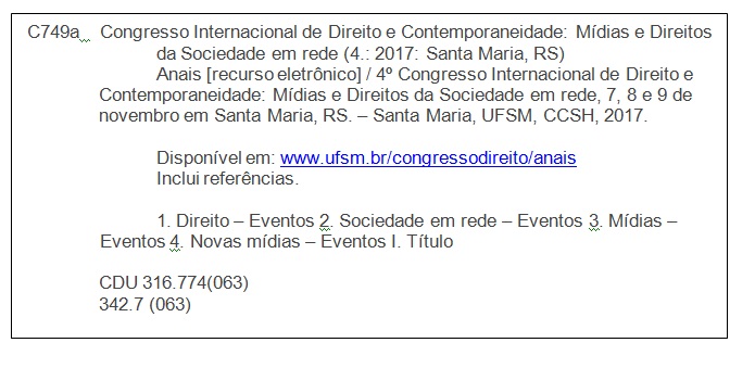 SOBRENOME, Nome do autor do artigo. Título do artigo. In: 4 CONGRESSO INTERNACIONAL DIREITO E CONTEMPORANEIDADE: mídias e direitos da sociedade em rede. Anais… Santa Maria (RS): UFSM, 2017. Disponível em: <http//www.ufsm.br/congressodireito/anais>. Acesso em: dia, mês e ano.