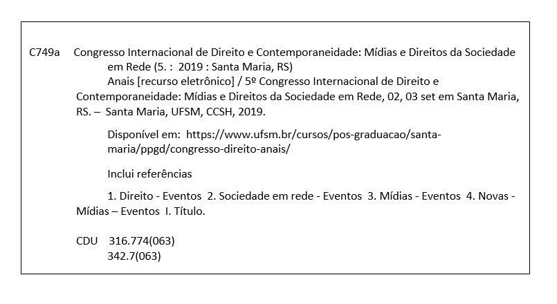 SOBRENOME, Nome do autor do artigo. Título do artigo. In: 5 CONGRESSO INTERNACIONAL DIREITO E CONTEMPORANEIDADE: mídias e direitos da sociedade em rede. Anais… Santa Maria (RS): UFSM, 2019. Disponível em: https://www.ufsm.br/cursos/pos-graduacao/santa-maria/ppgd/congresso-direito-anais . Acesso em: dia, mês e ano.