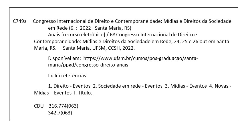 SOBRENOME, Nome do autor do artigo. Título do artigo. In: 6 CONGRESSO INTERNACIONAL DIREITO E CONTEMPORANEIDADE: mídias e direitos da sociedade em rede. Anais… Santa Maria (RS): UFSM, 2022. Disponível em: https://www.ufsm.br/cursos/pos-graduacao/santa-maria/ppgd/congresso-direito-anais . Acesso em: dia, mês e ano.