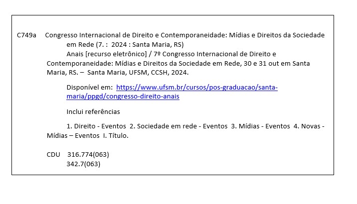 SOBRENOME, Nome do autor do artigo. Título do artigo. In: 7 CONGRESSO INTERNACIONAL DIREITO E CONTEMPORANEIDADE: mídias e direitos da sociedade em rede. Anais… Santa Maria (RS): UFSM, 2024. Disponível em: https://www.ufsm.br/cursos/pos-graduacao/santa-maria/ppgd/congresso-direito-anais . Acesso em: dia, mês e ano.