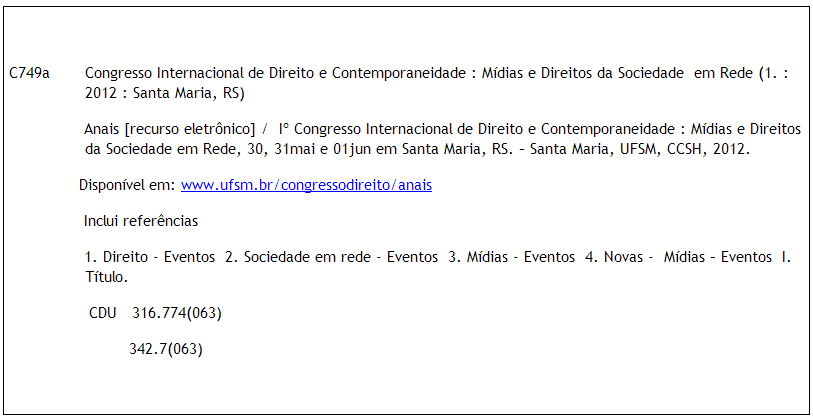 SOBRENOME, Nome do autor do artigo. Título do artigo. In: I CONGRESSO INTERNACIONAL DIREITO E CONTEMPORANEIDADE: mídias e direitos da sociedade em rede. Anais… Santa Maria (RS): UFSM, 2012. Disponível em: <http//www.ufsm.br/congressodireito/anais>. Acesso em: dia, mês e ano.