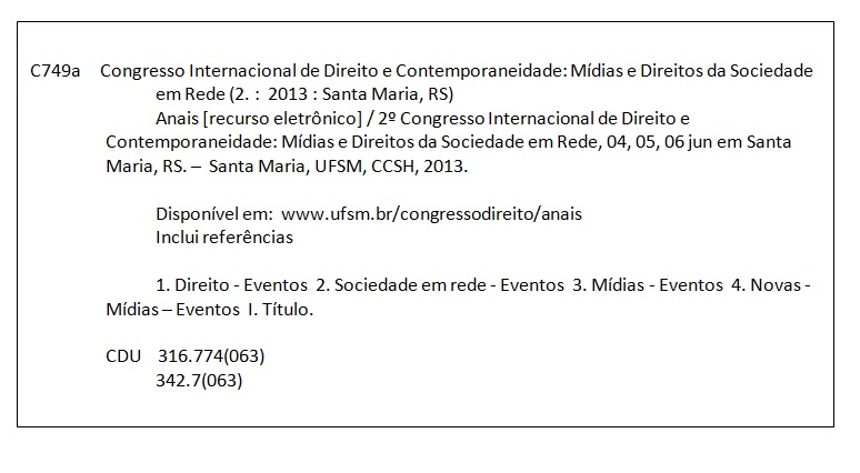 SOBRENOME, Nome do autor do artigo. Título do artigo. In: 2 CONGRESSO INTERNACIONAL DIREITO E CONTEMPORANEIDADE: mídias e direitos da sociedade em rede. Anais… Santa Maria (RS): UFSM, 2013. Disponível em: <http//www.ufsm.br/congressodireito/anais>. Acesso em: dia, mês e ano.