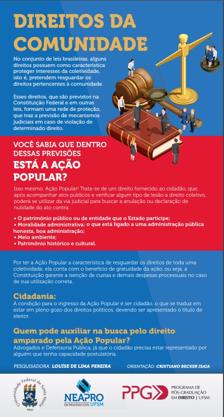 Por meio do estudo de decisões judiciais e editoriais foi revelado que a Ação Popular possui aspectos positivos e negativos. O primeiro relacionado a identificação de exemplos de uso correto para defender a comunidade, mostrando que é uma ação com capacidade para enfrentar os desafios do atual contexto. Já o segundo referente a visualização que algumas pessoas ingressavam com a Ação Popular devido questões políticas, com o intuito de defender interesses individuais ou de forma negligente. Assim, a partir do exposto no trabalho e considerando o potencial e a importância da Ação Popular para a sociedade, não se pode desconsiderar a relevância da população ter conhecimento acerca dos direitos da comunidade e a educação jurídica. Para tanto, como forma de divulgação da Ação Popular e de incentivo ao uso consciente, a dissertação gerou um produto com o objetivo de propagar esse mecanismo em sociedade, o qual é apresentado a seguir: