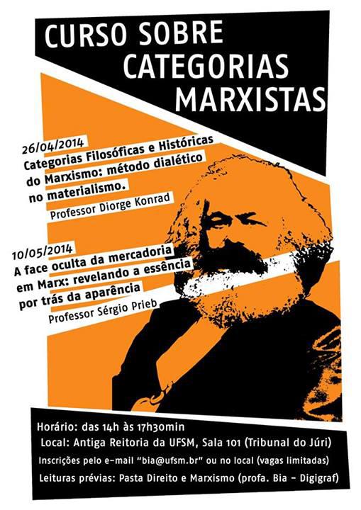Em abril e maio de 2014, o NUDMARX ofereceu um curso sobre categorias marxistas. O evento contou com a participação do Prof. Dr. Diorge Alceno Konrad e do Prof. Dr. Sérgio Alfredo Massen Prieb, que abordaram respectivamente as temáticas relacionadas sobre o método dialético e o conceito de mercadoria na obra “O Capital” de Karl Marx.