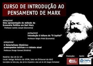 Nos meses de abril e maio de 2016, ocorreu o Curso “Introdução ao pensamento de Marx”, através de aulas ministradas pelo Prof. Dr. Diorge Alceno Konrad, Prof. Dr. Sérgio Alfredo Massen Prieb e Prof. Dr. Lázaro Camilo Recompensa Joseph no Centro de Ciências Sociais e Humanas da Universidade Federal de Santa Maria. A carga horária do curso foi de 16 horas.