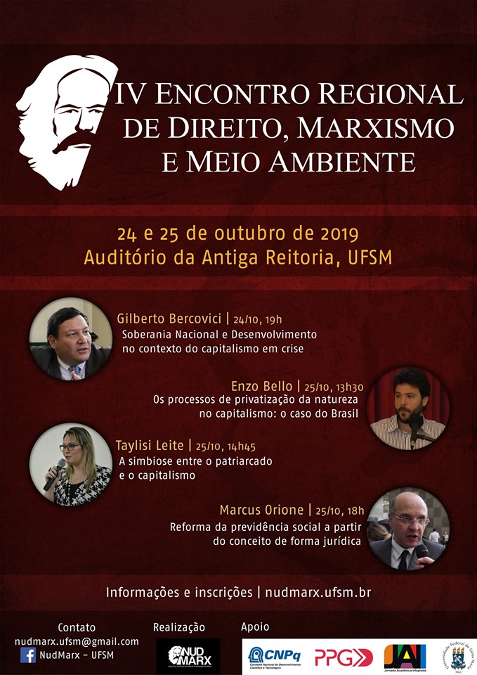 O “IV Encontro regional de direito, marxismo e meio ambiente” consiste em um evento de caráter científico organizado pelo Núcleo de Direito, Marxismo e Meio Ambiente (NUDMARX), vinculado ao departamento de Direito da Universidade Federal de Santa Maria (UFSM), sob minha coordenação.