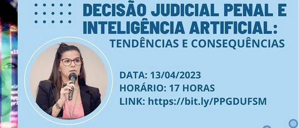 O Núcleo de Direito Informacional (NUDI) da UFSM, juntamente com o Programa de Pós-Graduação em Direito (PPGD/UFSM) convida toda a comunidade a participar da palestra “Decisão judicial penal e inteligência artificial: tendências e consequências“, ministrada pela Dra. Luiza Rosso Mota, no dia 13/04/2023, ao vivo, às 17 horas.