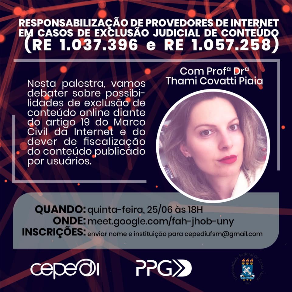 O evento vai ocorrer no dia 25 de junho, quinta-feira, às 18h via Google Meet, e conta com a presença da Prof. Dra. Thami Covatti, do PPGD da URI/Santo Ângelo.