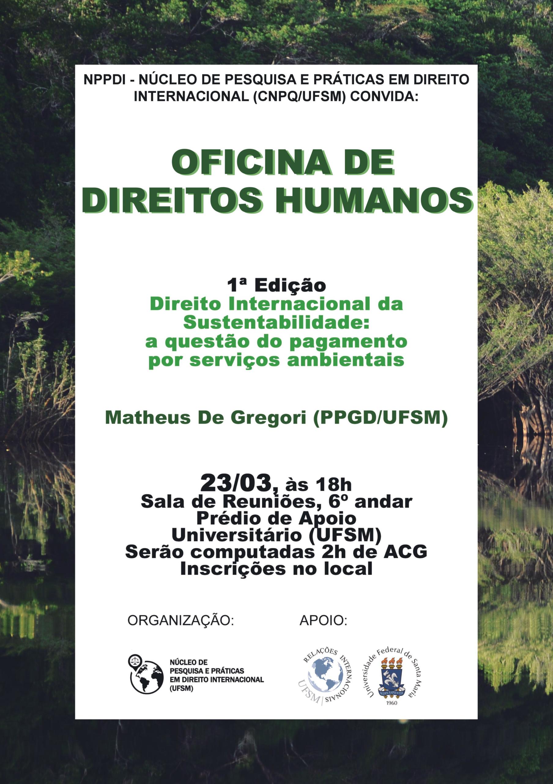 A primeira edição de 2017 das Oficinas de Direitos Humanos acontecerá no dia 23 de Março, as 17h30, na Sala de Reuniões do Departamento de Economia e Relações Internacionais da UFSM. Nesta oportunidade o mestre em direito Matheus De Gregori vai falar sobre o “Direito Internacional da Sustentabilidade: a questão do pagamento por serviços ambientais”. A atividade é aberta à comunidade universitária e também a comunidade externa. Aos interessados, será disponibilizado certificado de duas horas de ACG. Inscrições gratuitas e no local.