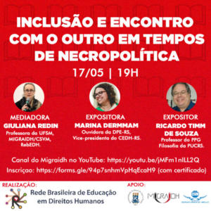 Inclusão e Encontro com o Outro em Tempos de Necropolítica contará com a participação do professor do PPG de Filosofia da PUC-RS, Ricardo Timm de Souza, da ouvidora-geral da Defensoria Pública do Estado do RS, Marina Dermmam, e da professora do PPGD da UFSM e coordenadora do Migraidh / Cátedra Sérgio Vieira de Mello da UFSM, Giuliana Redin (mediadora).