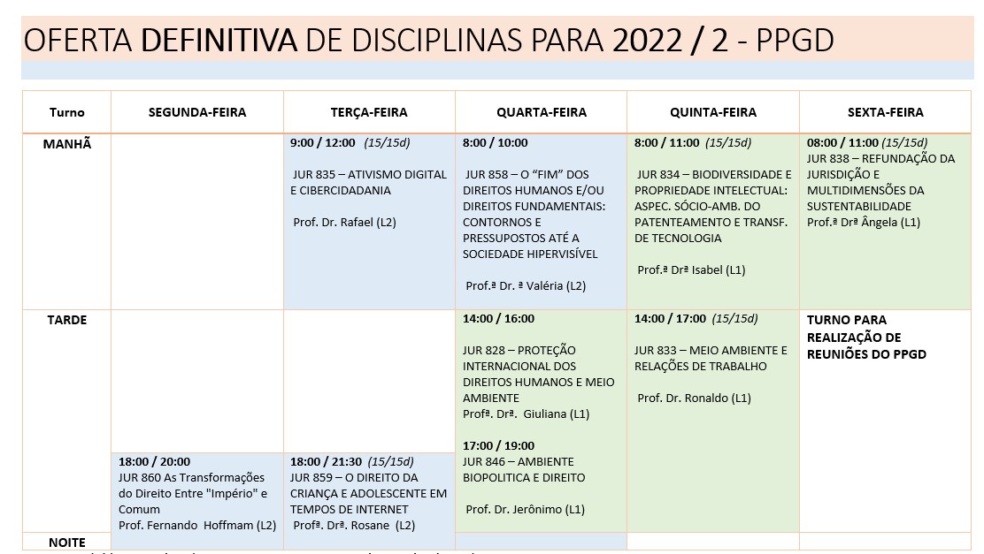A Coordenação do PPGD divulga a oferta de disciplinas para o segundo semestre de 2022. As matrículas ocorrem conforme o calendário da UFSM e são realizadas pelo Portal do Aluno. Para ingressantes em 2022 a matrícula somente será possível se o Plano de Estudos já tiver sido aprovado.