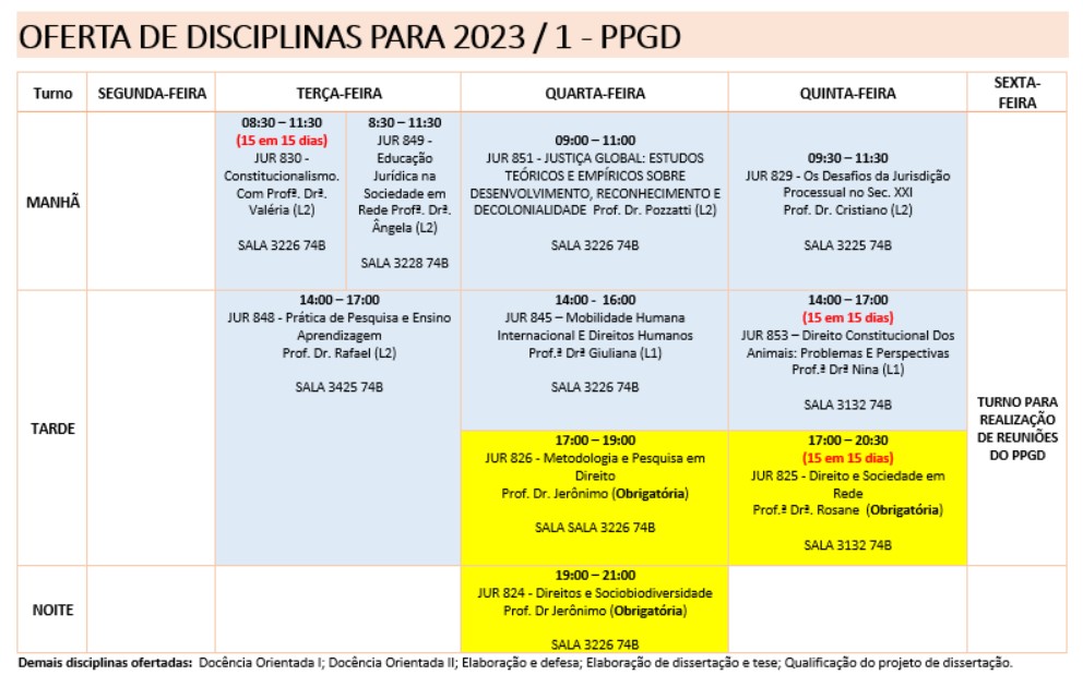 O arquivo com a oferta em PDF pode ser acessado clicando em Oferta de disciplinas PPGD – 1º Semestre de 2023.
