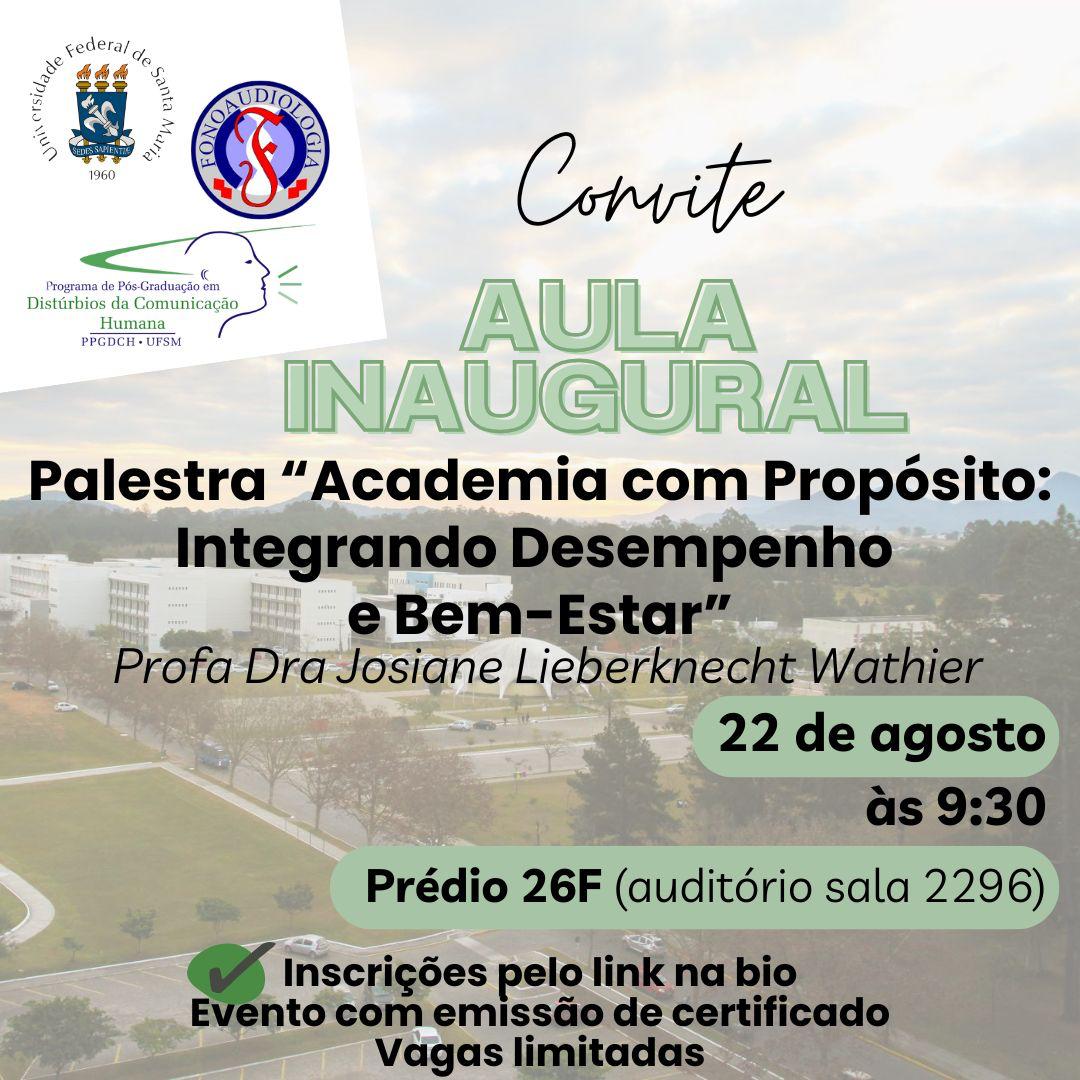 O PPG em Distúrbios da Comunicação Humana convida a comunidade acadêmica para Aula Inaugural, que acontecerá no dia 22 de agosto de 2025, às 09:30, no auditório do Prédio 26F. A professora doutora Lisiane Liebernecht Wathier palestrará sobre o tema: “Academia com propósito: integrando desempenho e bem estar”.