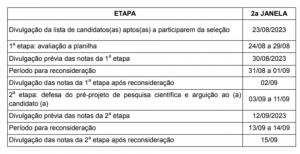 A seleção ocorrerá no período de 24 de agosto de 2023 a 15 de setembro 2023 para a segunda janela, conforme o cronograma a seguir: