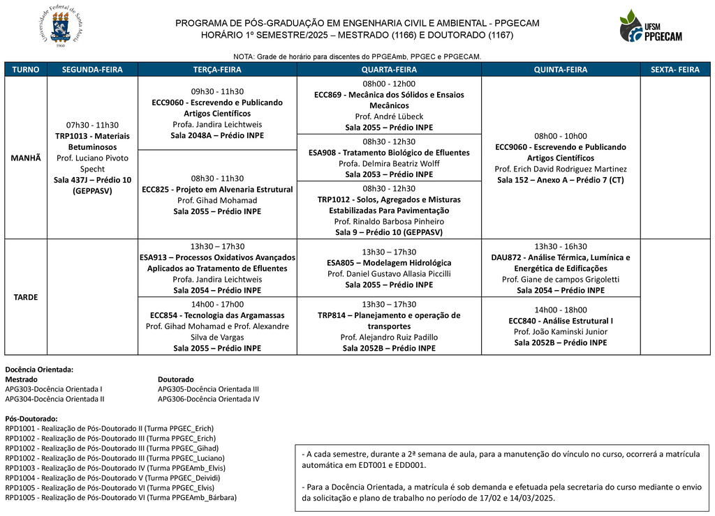 O Programa de Pós-Graduação em Engenharia Civil – PPGEC e o Programa de Pós-Graduação em Engenharia Ambiental –    PPGEAmb estão fusionados e tornaram-se o    PPGECAM – Programa de Pós-Graduação em Engenharia Civil e Ambiental. ⇒ A grade de horários das disciplinas deve ser acessada no menu  Horário no site do PPGECAM.