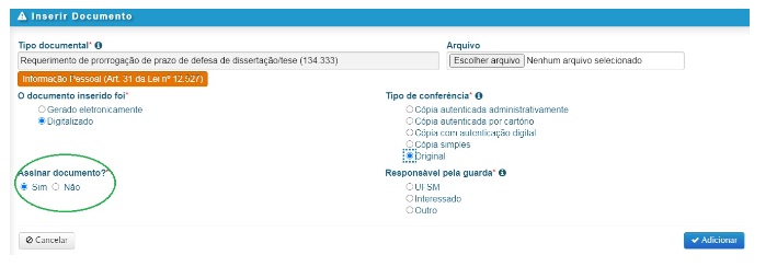 => O item ‘Tipo documental’ refere-se a qual tipo de processo você está abrindo e que será: Processo de prorrogação de prazo para defesa de dissertação/tese (134.333).