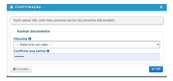 - Na tela acima, Inserir Documentos, já constam algumas opções de Tipos de Documentos. Para adicionar, você deve clicar no ícone +Adicionar que aparece à frente do documento. Para localizar e inserir outros documentos ir em +Adicionar – Enviar.