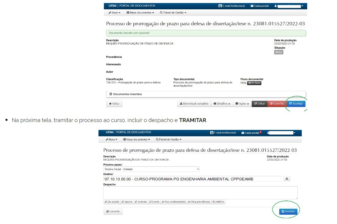 Atenção: O discente poderá acompanhar a situação da sua solicitação com o nº do processo PEN gerado no Portal Documentos ou em sua Caixa Postal no Portal Estudantil no menu lateral, Interessado.