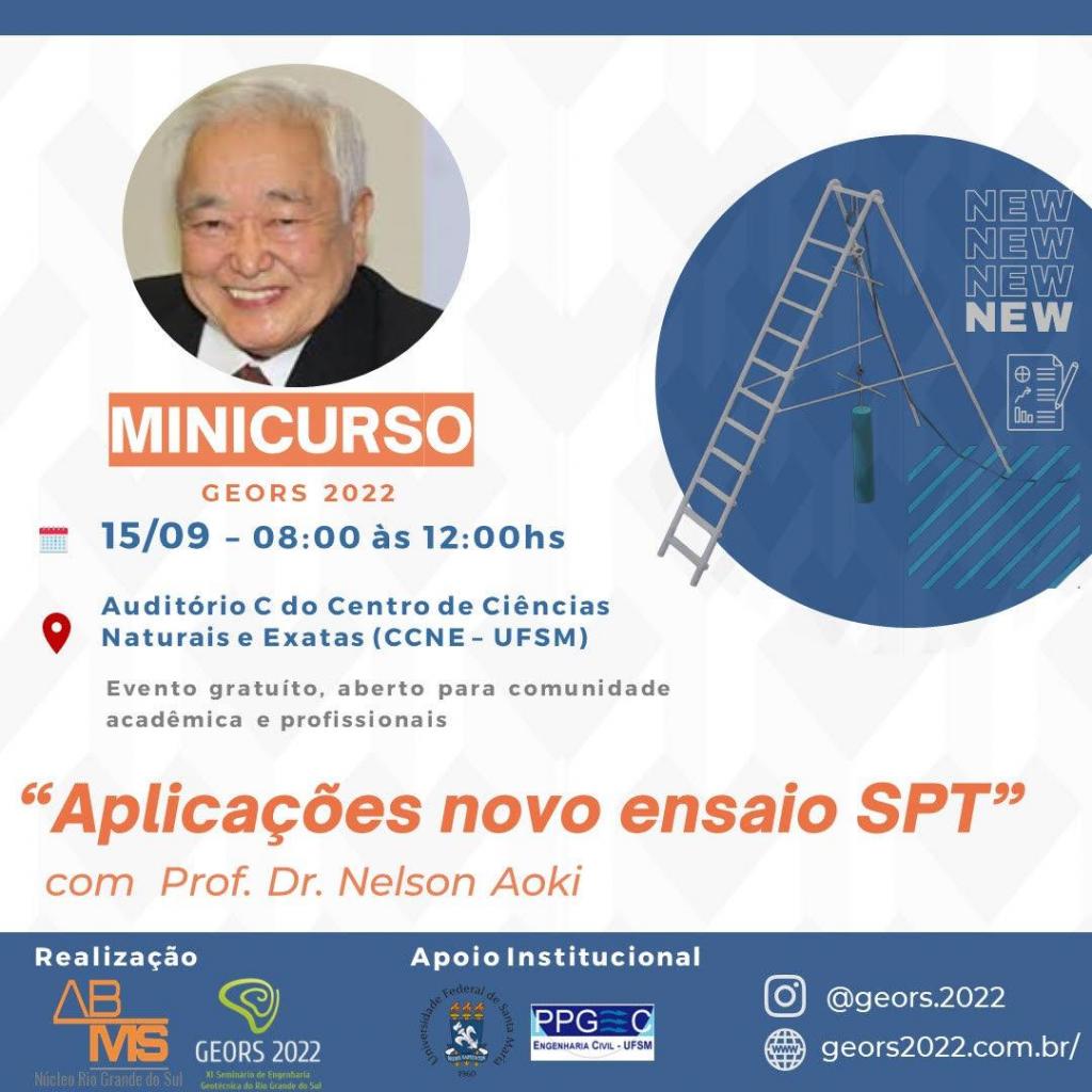 Convidamos você para participar do minicurso “Aplicações do novo ensaio SPT” ministrado pelo professor NELSON AOKI, que será realizado no dia 15 de setembro de 2022 das 8:00 até as 12:00 horas, de maneira PRESENCIAL, no Auditório C do Centro de Ciências Naturais e Exatas (CCNE), no campus da UFSM em Santa Maria. (Localização do auditório: https://goo.gl/maps/osRFm45VgHYW7pYJ6)