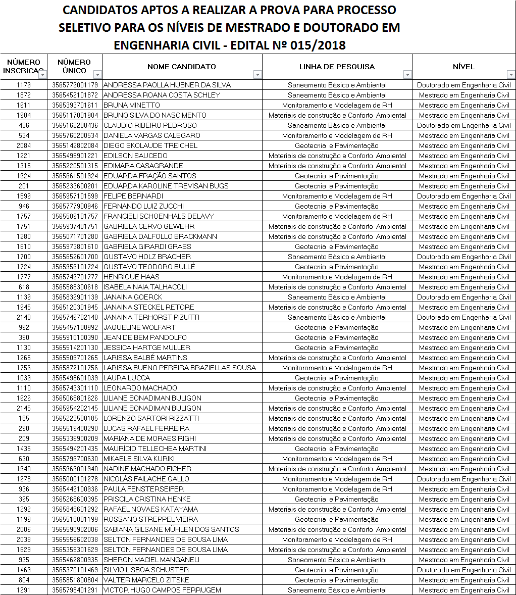 20/08/2018: Já podem ser retirados os envelopes contendo a documentação enviada (candidatos aprovados e reprovados), estarão disponíveis até o dia 24 de setembro na secretaria do PPGEC, após serão descartados.