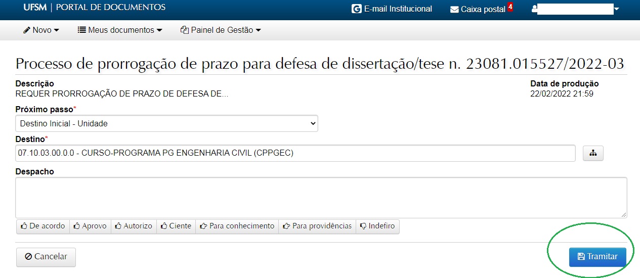 - Na próxima tela, tramitar o processo ao curso, incluir o despacho e TRAMITAR.