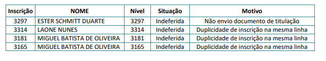 A Comissão de Seleção à 3ª janela de seleção ao Edital n. 65/2024 informa os(as) candidatos(as) inscritos, com base na Relação prévia de candidatos(as) que realizaram inscrição, os(as) candidatos e seus respectivos números de inscrição e nível da inscrição que tiveram a inscrição indeferida: