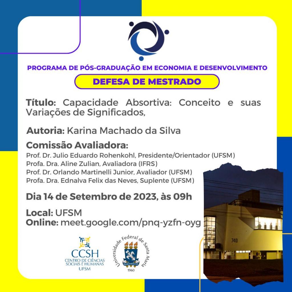 O curso de Pós-Graduação em Economia e Desenvolvimento está localizado em Campus Camobi – UFSM na modalidade Mestrado – Presencial sendo Integral o seu turno de funcionamento. A área de conhecimento do curso é classificada como Economia e Desenvolvimento. Atualmente, a coordenação é de responsabilidade de SIBELE VASCONCELOS DE OLIVEIRA, a coordenação substituta de EDNALVA FELIX DAS NEVES e a secretaria de RUBE AFONSO RODRIGUES NETO.