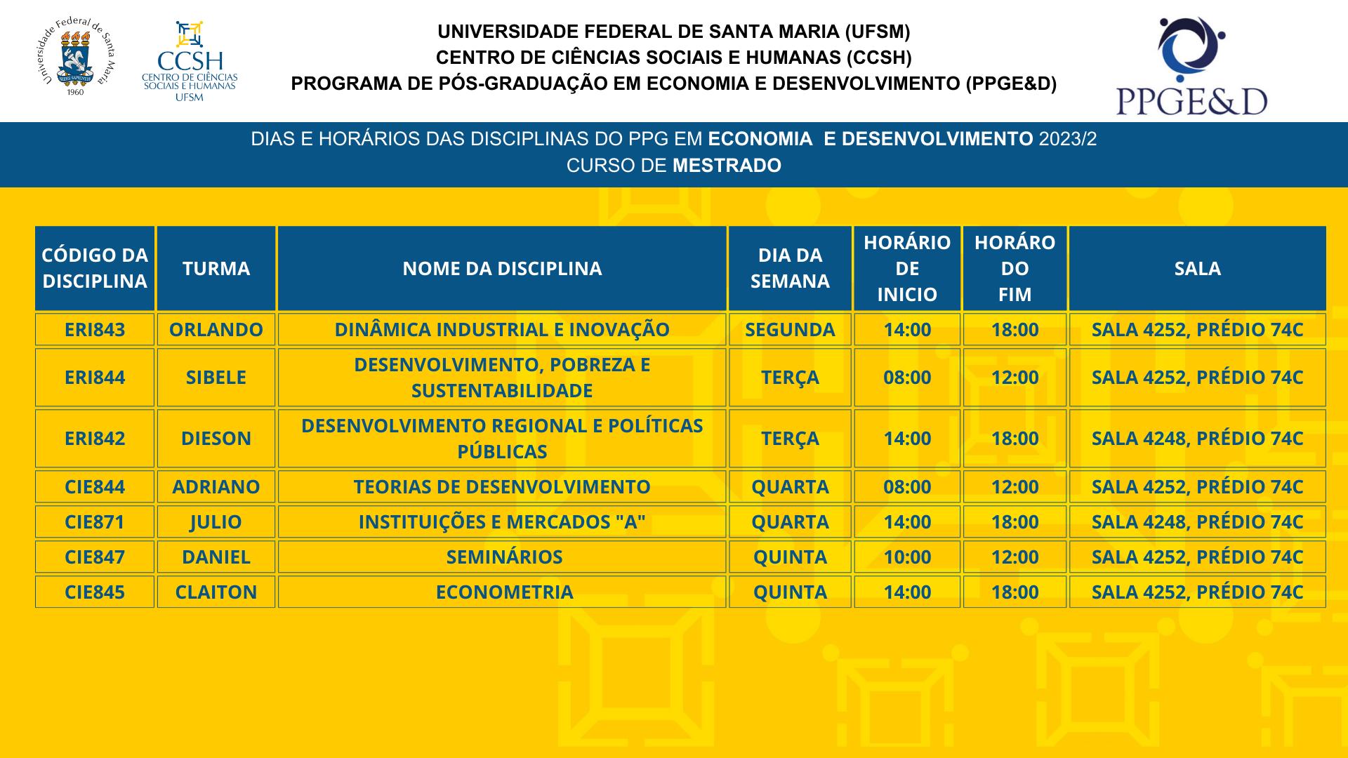 A Coordenação do Programa de Pós-Graduação em Economia e Desenvolvimento faz saber ao corpo discente a oferta de disciplinas do 2º semestre letivo de 2023, com respectivos horários e salas de aula.