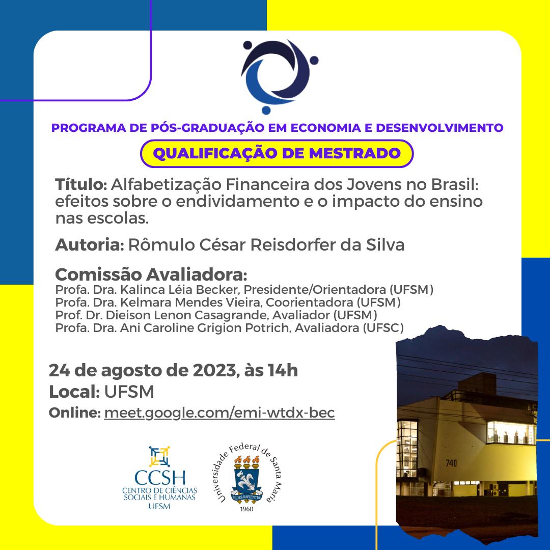 O Programa de Pós-Graduação em Economia e Desenvolvimento divulga a banca de qualificação de mestrado do aluno Rômulo César Reisdorfer da Silva, com o título “Alfabetização Financeira dos Jovens no Brasil: efeitos sobre o endividamento e o impacto do ensino nas escolas”, que ocorrerá no dia 24 de agosto, às 14 horas, na UFSM. Link para acesso à videoconferência: https://meet.google.com/emi-wtdx-bec.