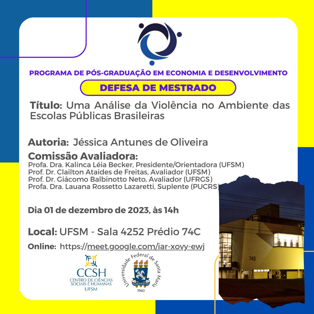 O Programa de Pós-Graduação em Economia e Desenvolvimento divulga a banca de defesa de mestrado da aluna Jéssica Antunes de Oliveira, com o título “Uma Análise da Violência no Ambiente das Escolas Públicas Brasileiras”, que ocorrerá no dia 01 de Dezembro, às 14 horas – Prédio 74C – Sala 4252.