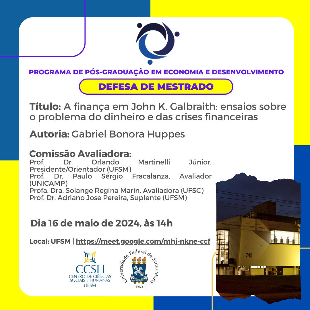 O Programa de Pós-Graduação em Economia e Desenvolvimento divulga a banca de defesa de mestrado do aluno Gabriel Bonora Huppes, com o título “A finança em John K. Galbraith: ensaios sobre o problema do dinheiro e das crises financeiras”, que ocorrerá no dia 16 de maio, às 14 horas.