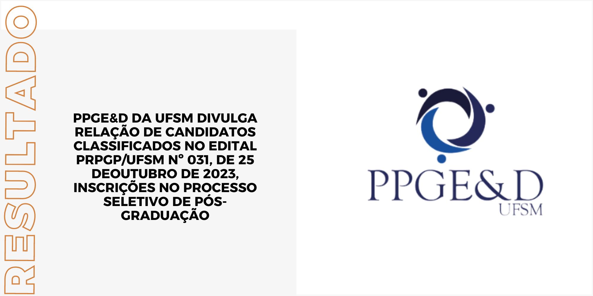 PPGE&D DA UFSM DIVULGA RELAÇÃO DE CANDIDATOS CLASSIFICADOS NO EDITAL PRPGP/UFSM Nº 031, DE 25 DE OUTUBRO DE 2023, INSCRIÇÕES NO PROCESSO SELETIVO DE PÓS-GRADUAÇÃO