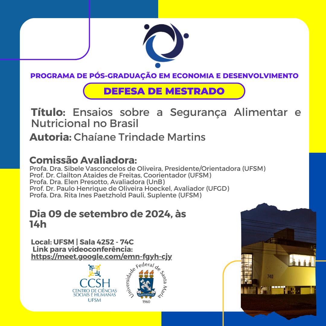 O Programa de Pós-Graduação em Economia e Desenvolvimento divulga a banca de defesa de mestrado da aluna Chaíane Trindade Martins, com o título “Ensaios sobre a Segurança Alimentar e Nutricional no Brasil”, que ocorrerá no dia 09 de setembro, às 14 horas.