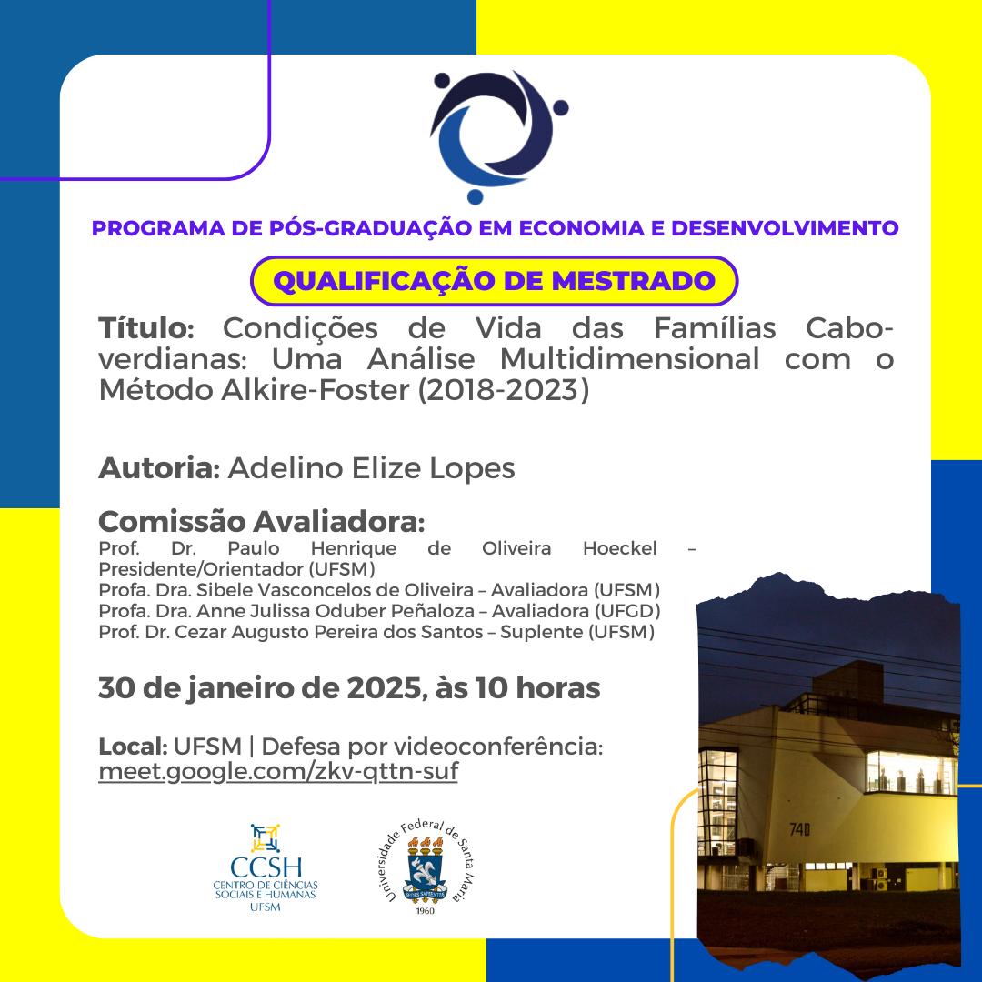 O Programa de Pós-Graduação em Economia e Desenvolvimento divulga a banca de qualificação de mestrado do aluno Adelino Elize Lopes, com o título “Condições de Vida das Famílias Cabo-verdianas: Uma Análise Multidimensional com o Método Alkire-Foster (2018-2023)”, que ocorrerá 30 de janeiro de 2025, às 10 horas, por videoconferência, link para acesso:  meet.google.com/zkv-qttn-suf