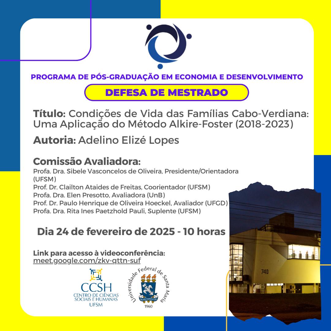O Programa de Pós-Graduação em Economia e Desenvolvimento divulga a banca de defesa de mestrado do aluno Adelino Elizé Lopes, com o título “Condições de Vida das Famílias Cabo-Verdiana: Uma Aplicação do Método Alkire-Foster (2018-2023)”, que ocorrerá no dia 24 de fevereiro de 2025, às 10 horas.