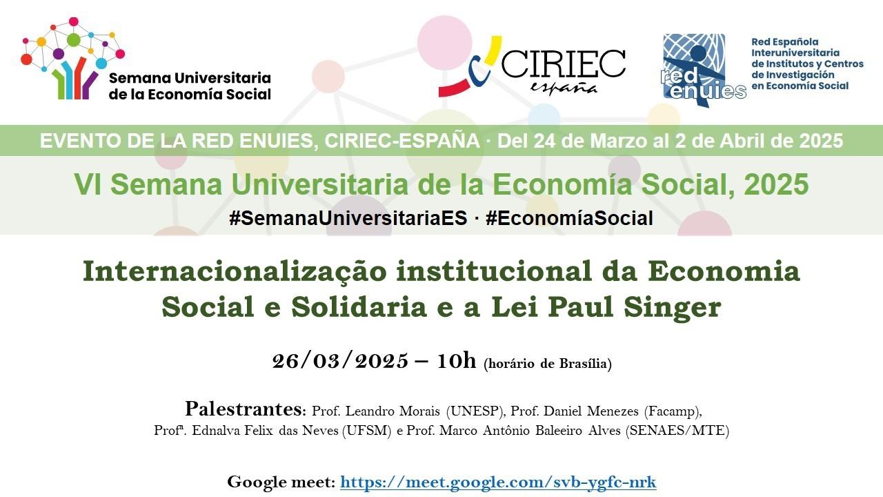 A docente permanente do Programa de Pós-Graduação em Economia & Desenvolvimento, Drª Ednalva Felix das Neves, participou da Semana Universitaria de la Economia Social, organizada pela Red Enuies e pelo Centro Internacional de Investigación e Información sobre la Economía Pública, Social y Cooperativa da Espanha. O evento teve por tema a “Internacionalização institucional da Economia Social e Solidaria e a Lei Paul Singer” e aconteceu de forma remota com a participação dos também docentes Prof. Leandro Morais (UNESP), Prof. Daniel Menezes (Facamp) e Prof. Marco Antônio Baleeiro Alves (SENAES/MTE).