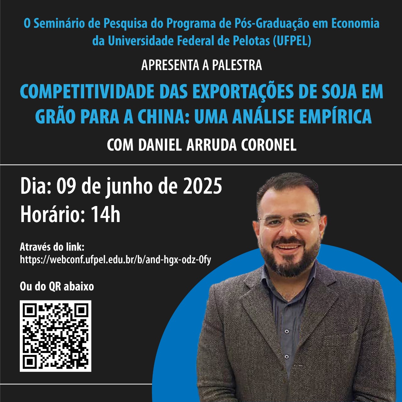 O Programa de Pós-Graduação em Economia e Desenvolvimento divulga a palestra que será ministrada pelo professor Daniel Arruda Coronel, docente deste Programa, intitulada “COMPETITIVIDADE DAS EXPORTAÇÕES DE SOJA EM GRÃO PARA A CHINA: UMA ANÁLISE EMPÍRICA”.