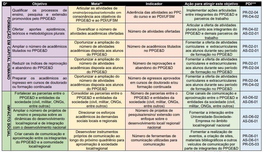 | 1 | Estabelecer e ampliar a integração com outras PPGs da UFSM e de outras Universidades; |
