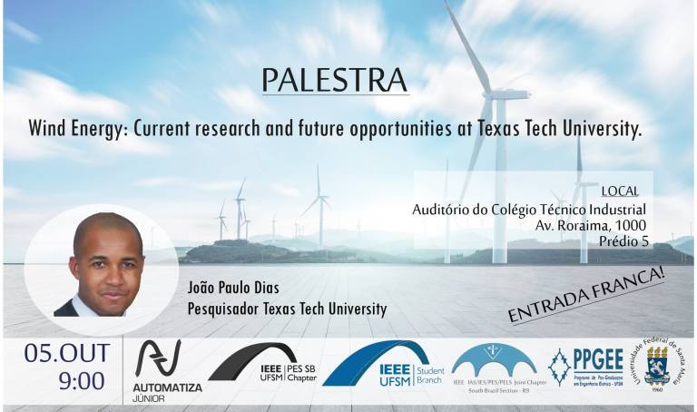 No dia 05/10 ocorrera a palestra ” Wind Energy: Current Research and Future Opportunities at Texas Tech University” do Pesquisador João Paulo Dias da Texas Tech University no auditório do CTISM as 09:00h. Além do tema de Energia Eólica o Pesquisador irá apresentar oportunidades de Pesquisa na Texas Tech University.