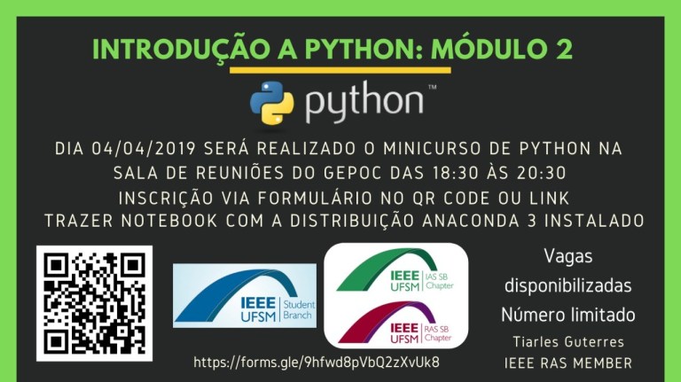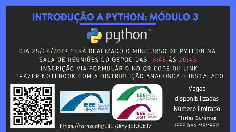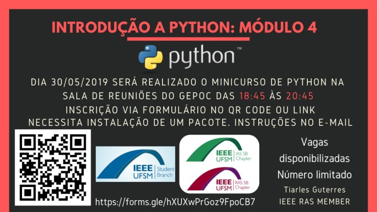 The workshop was organized by the IEEE IAS UFSM SB Chapter and presented by the Eng. Tiarles Guterres. All the classes are recorded and available on youtube.