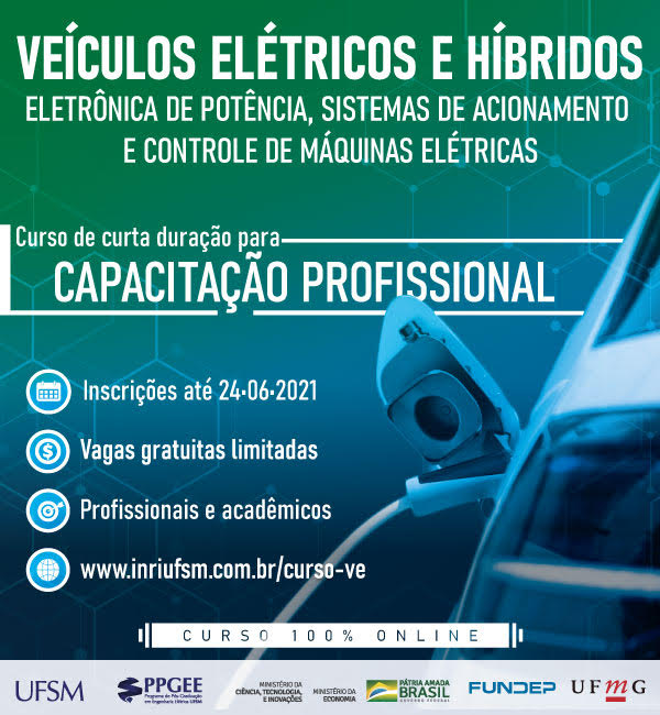 Estão abertas as inscrições para o curso de curta duração para capacitação profissional de Eletrônica de Potência, Sistemas de Acionamento e Controle de Máquinas Elétricas voltado a Veículos Elétricos e Híbridos, que ocorrerá de forma totalmente remota e contará com duas edições, sendo a primeira no mês de julho e a segunda nos meses de agosto e setembro.