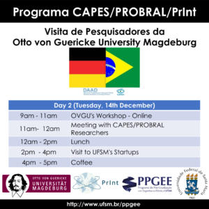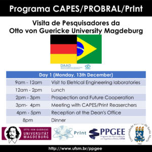 Nos dias 13 e 14 de dezembro de 2021, o Programa de Pós-Graduação em Engenharia Elétrica (PPGEE) da Universidade Federal de Santa Maria (UFSM) receberá a visita de pesquisadores da Otto von Guericke University Magdeburg (OVGU), instituição localizada na Alemanha. Esta ação é fruto do Programa CAPES/DAAD PROBRAL e CAPES/PrInt da UFSM que tem como Coordenador Brasileiro o Prof. Daniel Pinheiro Bernardon (PPGEE/UFSM) e Coordenador Alemão o Prof. Martin Wolter (OVGU).