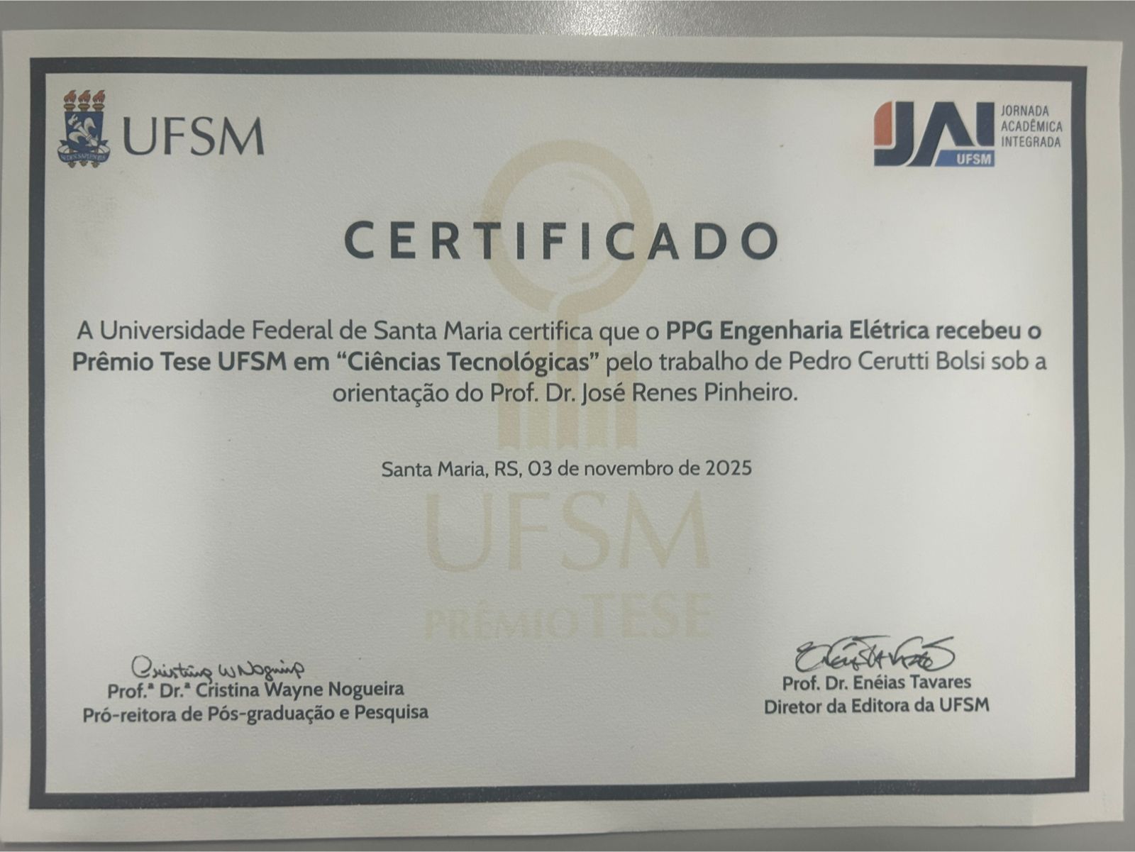 É com grande satisfação que o Programa de Pós-Graduação em Engenharia Elétrica (PPGEE) comunica que o Dr. Pedro Cerutti Bolsi foi agraciado com o Prêmio Tese UFSM 2025, na categoria Ciências Tecnológicas.