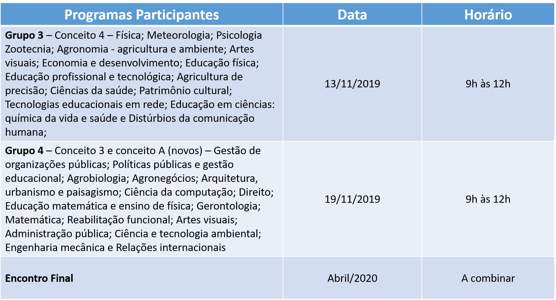 Em relação ao planejamento de médio prazo (quadriênio de avaliação seguinte), pretende-se incluir os novos objetivos elencados a seguir, além de manter os do quadriênio atual com revisão de ações e metas:
