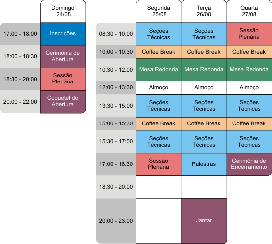 - Profissionais: pasta do congresso com todos os informativos promocionais, acesso a programação técnica, anais do evento, coffee-breaks, coquetel de abertura, almoços e jantar de encerramento.
