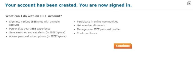 Você receberá uma mensagem informando que a conta foi criada. Clique em Continue.