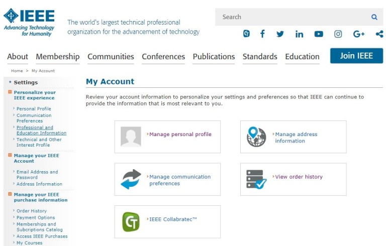 Seu cadastro no site ieee.org está criado. Agora vamos dar procedimento para o cadastro na organização IEEE. Primeiramente vamos cadastrar a UFSM. Deixe o cursor do mouse sobre o seu nome e clique em My Account.