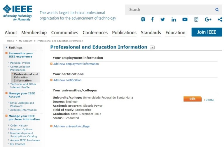- Se você já é membro IEEE, certifique-se que sua instituição de ensino cadastrada é “Universidade Federal de Santa Maria”.