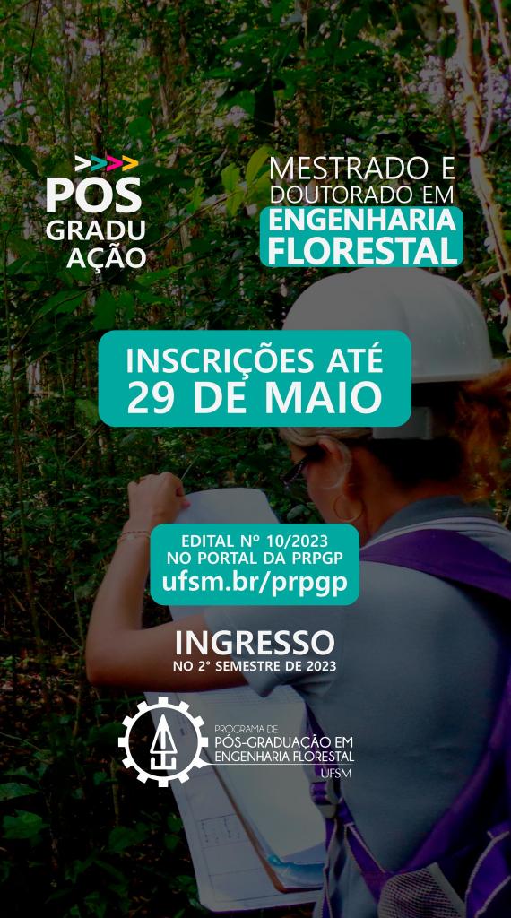 A Coordenação do Programa de Pós-Graduação em Engenharia Florestal (PPGEF) e a Pró-Reitora de Pós-graduação e Pesquisa (PRPGP) tornam público o Edital 010/2023 – Processo Seletivo de Pós-graduação – Ingresso no 2º semestre de 2023, em nível de Doutorado e Mestrado. As informações sobre o edital geral devem ser acessadas clicando aqui. Atenção neste link, pois as retificações serão publicadas nesta página.